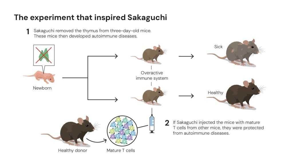 Shimon Sakaguchi je početkom 1980-ih u Japanu izolovao T ćelije koje su štitile miševe bez timusa od autoimunih bolesti, što je ukazivalo na postojanje posebne klase T ćelija koje smiruju imunološki sistem. Kasnijim eksperimentima 1995. godine Sakaguchi je predstavio regulatorne T ćelije, koje nose CD4 i CD25 proteine na površini.