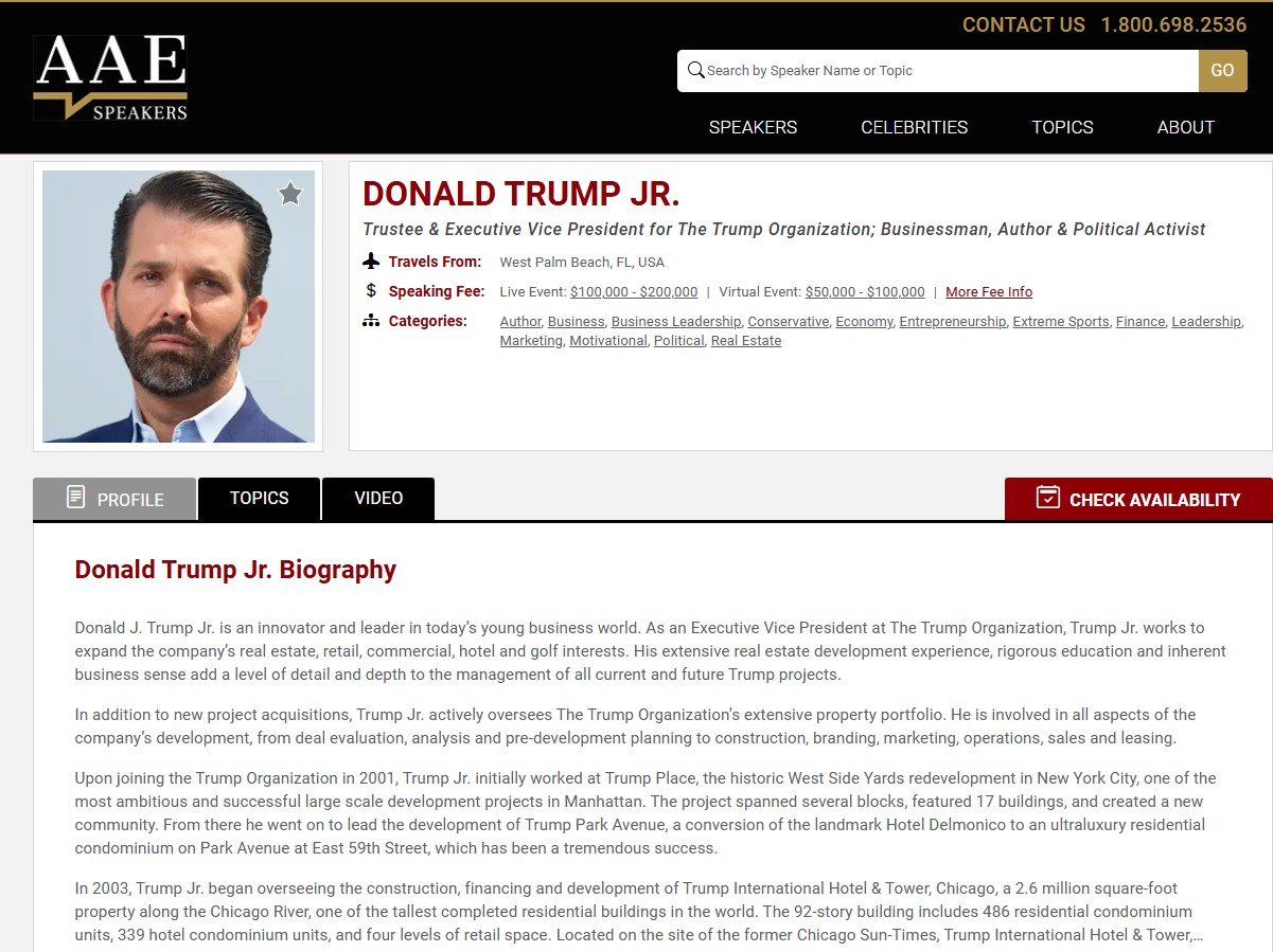 Prema službenoj stranici agencije, cifra koju morate izdvojiti ako želite da se na događaju/konferenciji koju organizujete obrati Trumpov sin iznosi od 100 do 200 hiljada dolara za obraćanje uživo (kao danas na panelu u Banjoj Luci) ili od 50 do 100 hiljada dolara za obraćanje putem interneta (online).
