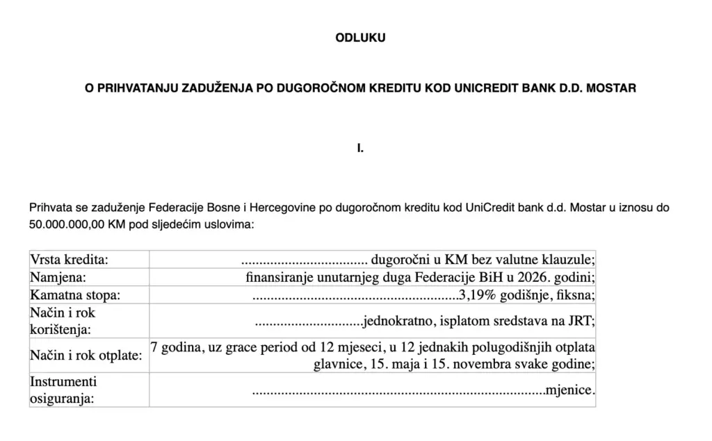 I tako, po principu “Autoceste FBiH okom, Vlada FBiH skokom”, Federalna vlada se prije nekoliko dana donijela odluku da se kod Unicredit banke Mostar zaduži za 50 miliona KM. I to po kamatnoj stopi od 3,19 posto. Kredit su uzeli na sedam godina. Planirano je da se po istom principu Vlada FBiH zaduži za dodatnih 100 miliona KM.