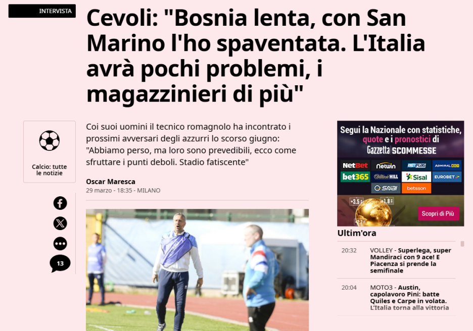 "Oni su spora ekipa, pomalo ukočena. Igraju sporim tempom, što je pozitivno za Azzurre. U Zenici sam pokušao usmjeriti igru na intenzitet, vršiti visoki presing i udvostručavati pritisak na nosioca lopte. Na terenu, međutim, imaju neke važne pojedinačne igrače, posebno vječnog Džeku", rekao je Cevoli, koji je prije San Marina vodio klubove poput Novare, Renate, Imolesea, Reggine...