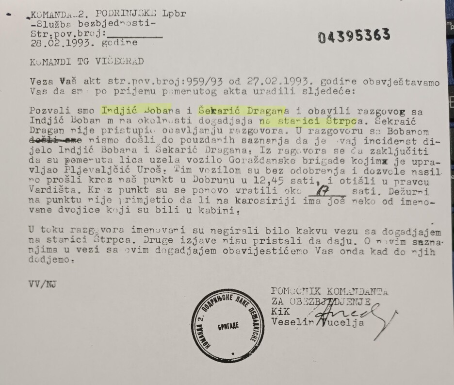 "28. februara 1993. godine Služba bezbjednosti Komande 2. plpbr Višegrad je Komandi TG Višegrad poslala odgovor na akt str. pov. br.: 959/93, od 27.02.1992. godine, u kome ih informišu da su pozvali Bobana Inđića i Dragana Šekarića i obavili razgovor sa Bobanom Inđićem na okolnosti događaja na stanici Štrpci. Navode i da Dragan Šekarić nije pristupio obavljanju razgovora. Nakon razgovora sa Bobanom Inđićem, obavijestili su: "Nismo došli do pouzdanih saznanja da je ovaj incident djelo Inđić Bobana i Šekarić Dragana, već zaključuju da su "pomenuta lica uzela vozilo Goraždanske brigade kojim je upravljao Pljevaljčić Uroš. Tim vozilom su bez odobrenja i dozvole nasilno prošli kroz punkt u Dobrunu u 12,45 sati i otišli u pravcu Vardišta. Kroz punkt su se ponovo vratili oko 17 sati. Dežurni na punktu nije primjetio da li na karoseriji ima još neko od imenovane dvojice koji su bili u kabini".