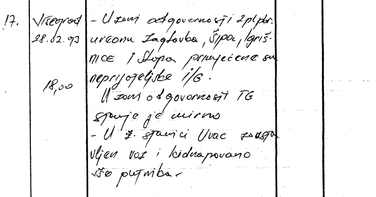 Prof. Kuka ukazuje na dokumente planiranog zločina. Tako je 28.februara 1993.godine komanda Taktičke Grupe Višegrad VRS evidentirala u Ratnom operativnom dnevniku za razdoblje 12.02.1993-10.11.1994. godine, pod rednim brojem 17 i kratku informaciju u kojoj je stajalo: '18,00. U ž. stanici Uvac zaustavljen voz i kidnapovano više putnika’.