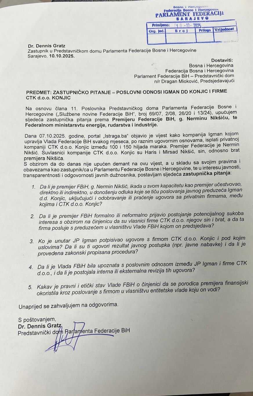 Zastupnik Demokratske fronte u Predstavničkom domu Parlamenta Federacije Bosne i Hercegovine, Dennis Gratz, podnio je zastupnička pitanja kojima traži pojašnjenja od premijera Federacije BiH Nermina Nikšića u vezi poslovanja javnog preduzeća Igman d.d. Konjic i privatne firme CTK d.o.o. Konjic, čiji su vlasnici, prema dostupnim podacima, sin i brat premijera Nikšića.