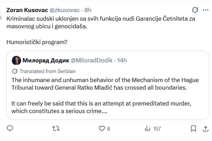-Kriminalac sudski uklonjen sa svih funkcija nudi Garancije Četniteta za masovnog ubicu i genocidaša, poručio je Zoran Kusovac.