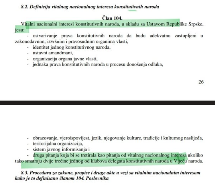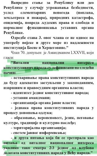 Umjesto toga, i Ustavom Republike Srpske i Poslovnikom Vijeća naroda propisano je da vitalni nacionalni interes jesu: i druga pitanja ako tako smatra 2/3 delegata jednog od klubova u Vijeću naroda.