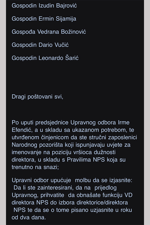 No, iako novi Upravni odbor funkcionira duže od mjesec dana, njegovi članovi nisu ispunili Magodine zahtjeve. Umjesto toga UO se odlučio imenovati vršitelja dužnosti direktora Narodnog pozorišta, te se obratio zaposlenima koji, kako stoji  u tom dopisu, „ispunjavaju uvjete za imenovanje na poziciju vršioca dužnost, u skladu sa pravilima NPS-a koji su sada na snazi“ da li prihvataju da budu v.d. direktori.. Prema informacijama kojima raspolaže „SB“, samo je glumac Izudin Bajrović prihvatio funkciju v.d. direktora, dok su ponudu odbili Vedrana Božinović, Ermin Sijamija, Dario Vučić i Leonardo Šarić.