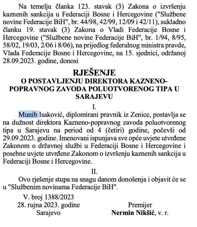 I predložila je. Vlada Federacije BiH je sedam dana kasnije imenovala Muniba Isakovića za direktora KPZ-a Sarajevo.
