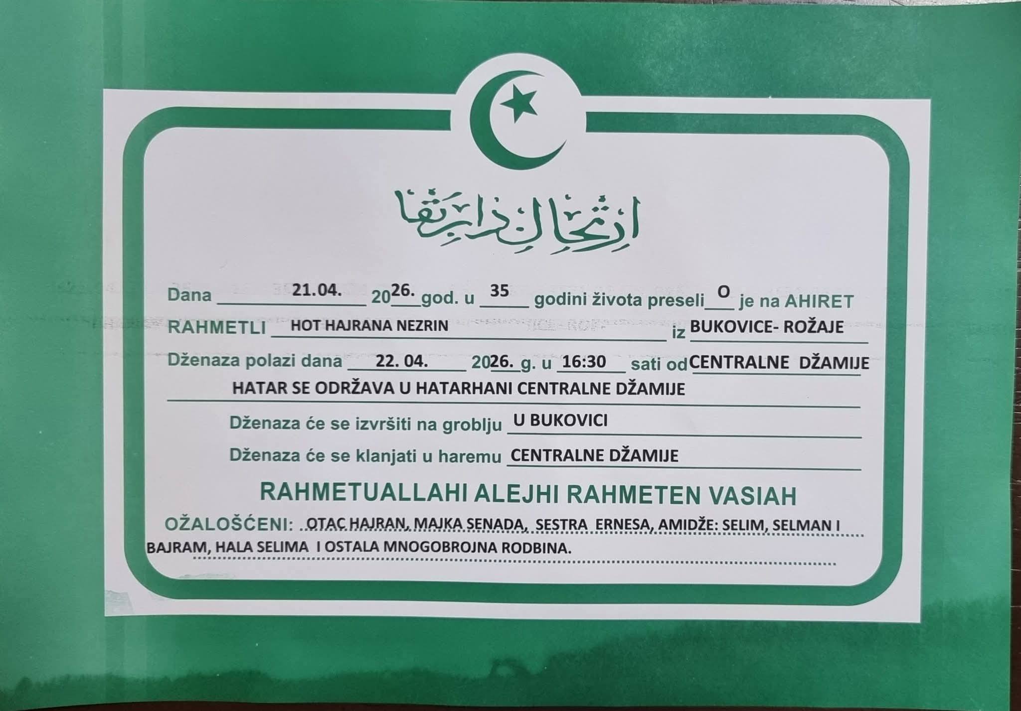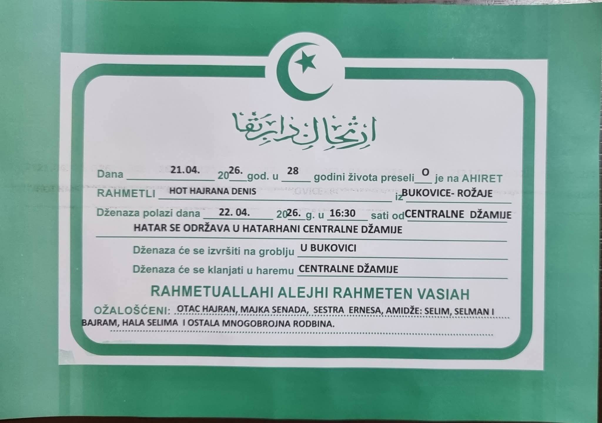 Prema osmrtnicama objavljenim u Rožajama, dženaza-namaz za rahmetli Denisa Hota bit će klanjana danas, 22. aprila 2026. godine u 16:30 sati ispred Centralne džamije, dok će ukop biti obavljen na groblju u Bukovici. Denis je preselio u 28. godini života.
