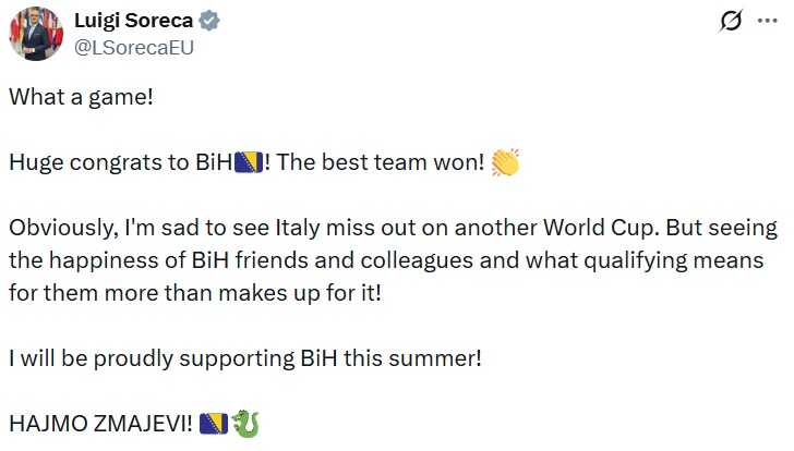 Šef Delegacije i specijalni predstavnik Evropske unije u Bosni i Hercegovini, Italijan Luigi Soreca čestitao je Bosni i Hercegovini na plasman u Mundijalu.