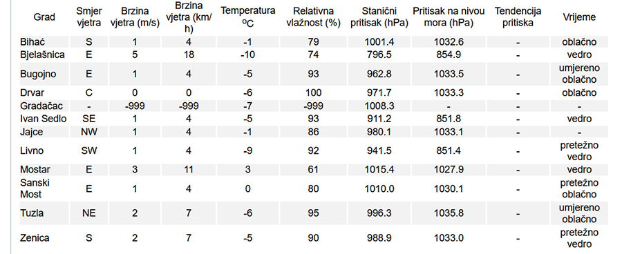Danas će u Bosni preovladavati niska oblačnost, a po kotlinama će biti i magle. Sunčano je na području Hercegovine, jugozapadu Bosne i na planinama. Vjetar je slab istočnog i sjeveroistočnog smjera. Najniža jutarnja temperatura zraka većinom između -7 i -2°C, na jugu zemlje do 3°C. Najviša dnevna temperatura zraka uglavnom između -3 i 2°C, na jugu zemlje od 9 do 12°C.