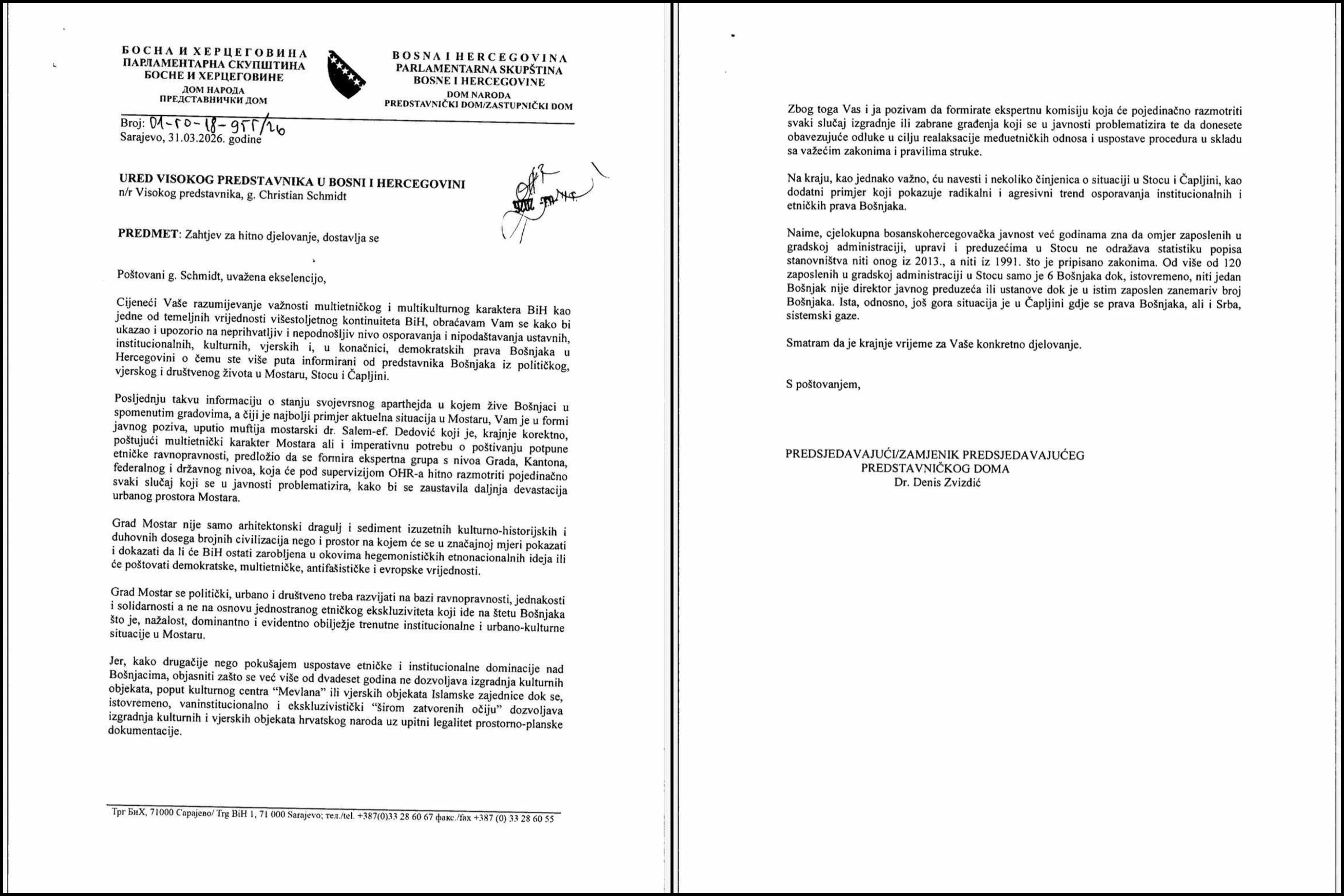 Predsjedavajući/Zamjenik predsjedavajućeg Predstavničkog doma Parlamentarne skupštine Bosne i Hercegovine dr. Denis Zvizdić uputio je zvaničan zahtjev Visokom predstavniku u Bosni i Hercegovini, Christianu Schmidtu, tražeći hitno djelovanje u cilju zaštite ustavnih, institucionalnih i demokratskih prava Bošnjaka, te očuvanja multietničkog karaktera države.